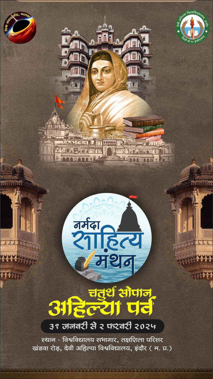 इंदौर विश्व संवाद केन्द्र मालवा के वार्षिक साहित्योत्सव ‘नर्मदा साहित्य मंथन’ के चतुर्थ सोपान “अहिल्या पर्व” का आयोजन 31 जनवरी से 2 फरवरी 2025 तक इन्दौर में होने जा रहा है। इस साहित्योत्सव का उद्देश्य समाज जीवन के विविध पक्षों पर विचार-मंथन कर समाज को वैचारिक रूप से जागरूक करना है। इस साहित्योत्सव के माध्यम से सांस्कृतिक और ऐतिहासिक जागरण के साथ ही, नागरिक कर्तव्य से संबंघित विषयों पर प्रबोधन के सत्र भी आयोजित होंगे। विशेष रूप से यह आयोजन युवाओं को राष्ट्र निर्माण और समाज सुधार में उनकी भूमिका को लेकर प्रेरित करेगा। साथ ही, लोकमाता अहिल्याबाई होल्कर के कृतित्व, पर्यावरणीय जागरूकता और भारतीय सांस्कृतिक मूल्यों के संरक्षण के लिए समाज में सकारात्मक बदलाव लाने का भी एक माध्यम होगा।